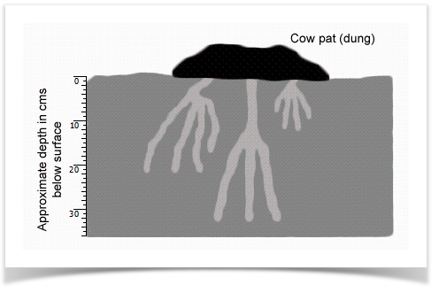 Introducing dung beetles into a pasture is a simple process: approximately 1,500 beetles are released; a handful at a time, into fresh cow pats 2 in the cow pasture. The beetles immediately disappear beneath the pats digging and tunnelling and, if they successfully adapt to their new environment, soon become a permanent, self-sustaining part of the local ecology. In time they multiply and within three or four years the benefits to the pasture are obvious.